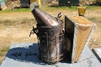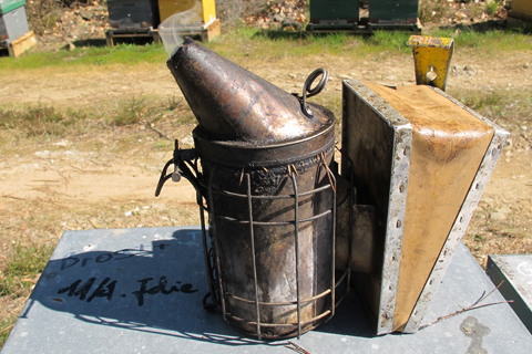 Un ENFUMOIR :c’est notre ange gardien ! Grâce à lui, nous pouvons ouvrir les ruches en maîtrisant l’agressivité naturelle des abeilles. La fumée est générée en brûlant au choix du carton, de l’herbe, du foin, des aiguilles de pin. Cette fumée maintient les abeilles dans la ruche et détourne leur attention le temps de notre visite.