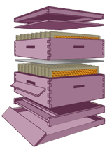 La ruche la plus courante en France est la ruche verticale à cadres ; elle se compose d’un empilement de caissons, de hauteur égale ou non, ouverts au-dessus et en dessous. En bas, on retrouve un plancher qui, débordant sur un côté, constitue une plate-forme, appelé planche d'envol, d’où entrent et sortent les abeilles. Il est surmonté des éléments principaux de la ruche : le corps et la hausse. Le corps de la ruche, la maison des abeilles !Composée de 10 cadres, elle joue le rôle de nurserie et de garde-manger pour le stockage du pollen et du miel. Nous veillons à ce que les abeilles aient suffisamment de provisions et de place pour se multiplier. Nous ne récoltons jamais les cadres des corps de la ruche.