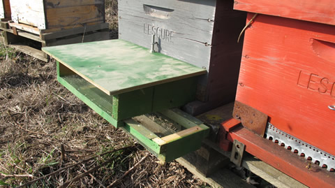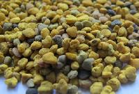 Nous récoltons le pollen en plaçant des trappes à l’entrée des ruches qui sont équipées de grilles. Ces grilles sont perforées de trous qui ont le diamètre de l’abeille. Celle-ci se faufile dans les trous pour entrer dans la ruche mais lors du passage, les pelotes de pollen sont décrochées et tombent dans un panier. Nous venons relever ce panier tous les deux jours.Nous mettons ensuite le pollen à sécher et il est prêt à être consommé.